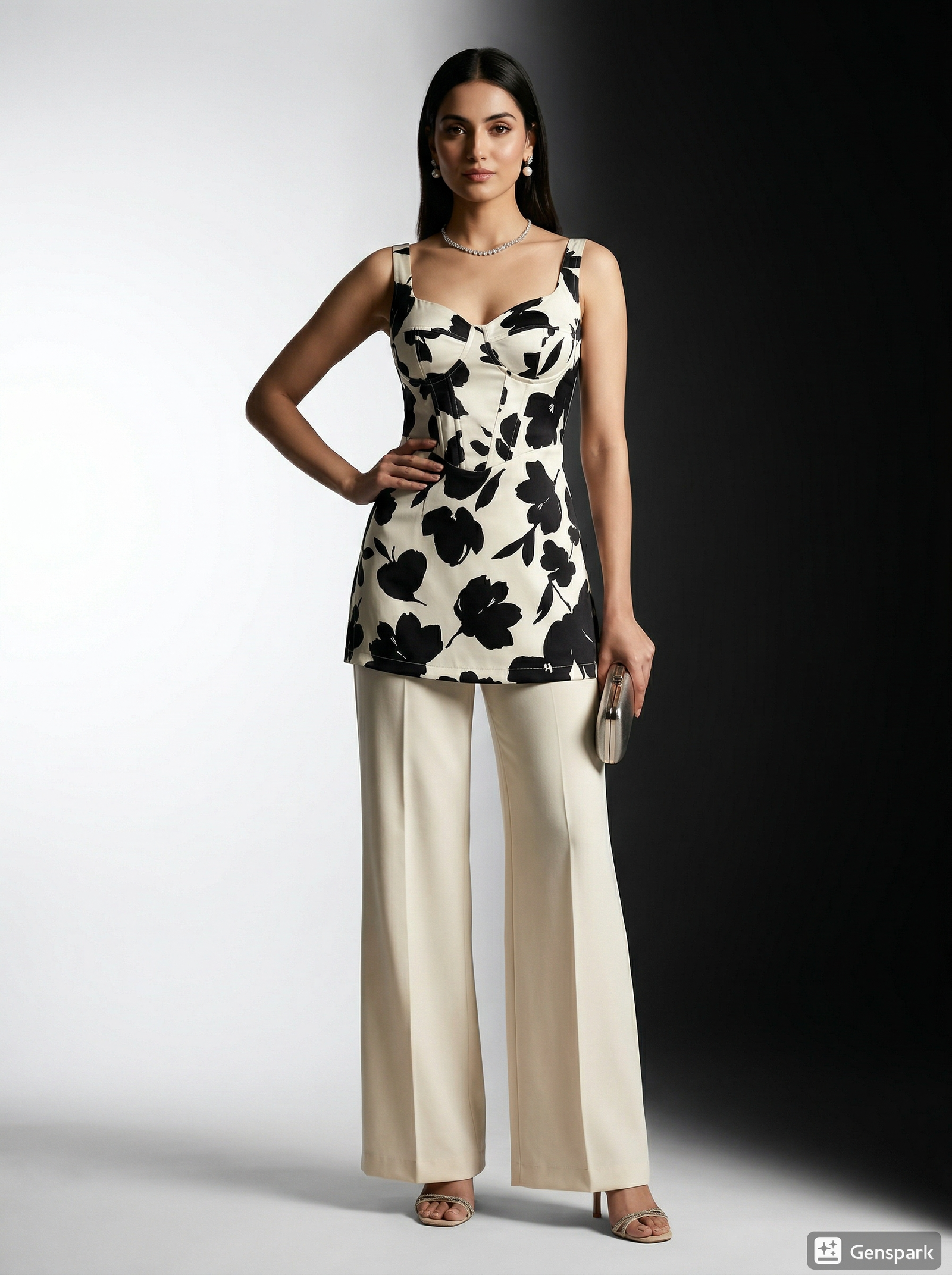 Step into effortless elegance with this ivory floral kurti and palazzo set. Designed with a structured fit and modern silhouette, it offers a perfect blend of style and comfort. The bold floral pattern adds a statement touch, while the relaxed palazzo ensures ease of movement—ideal for any occasion.